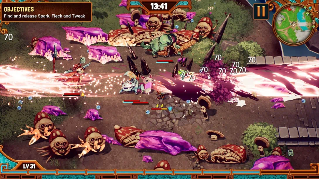 《荒野守护者崛起》(Wildkeepers Rising)是一款融合了Roguelite、弹幕射击与生物收集元素的动作RPG游戏,由Lioncode Games开发并发行。游戏以手绘风格的奇幻世界为舞台,玩家需驯服灵兽、组建队伍,抵御怪物入侵。